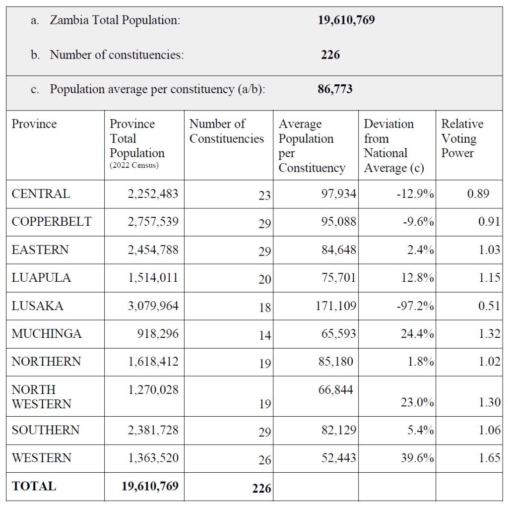 CCMG’s preliminary analysis reveals significant disparities in voting power across provinces. In particular, constituencies in Lusaka appear to be severely underrepresented compared to those in provinces such as Western, Muchinga, and North-Western. These imbalances mean that some constituencies, represented by Members of Parliament in the National Assembly, have way more citizens than others, thus contradicting the fundamental democratic principle of equal suffrage. As the ECZ has not yet released the full details on the new constituencies, including their populations and geographical boundaries, additional analysis is not yet possible.